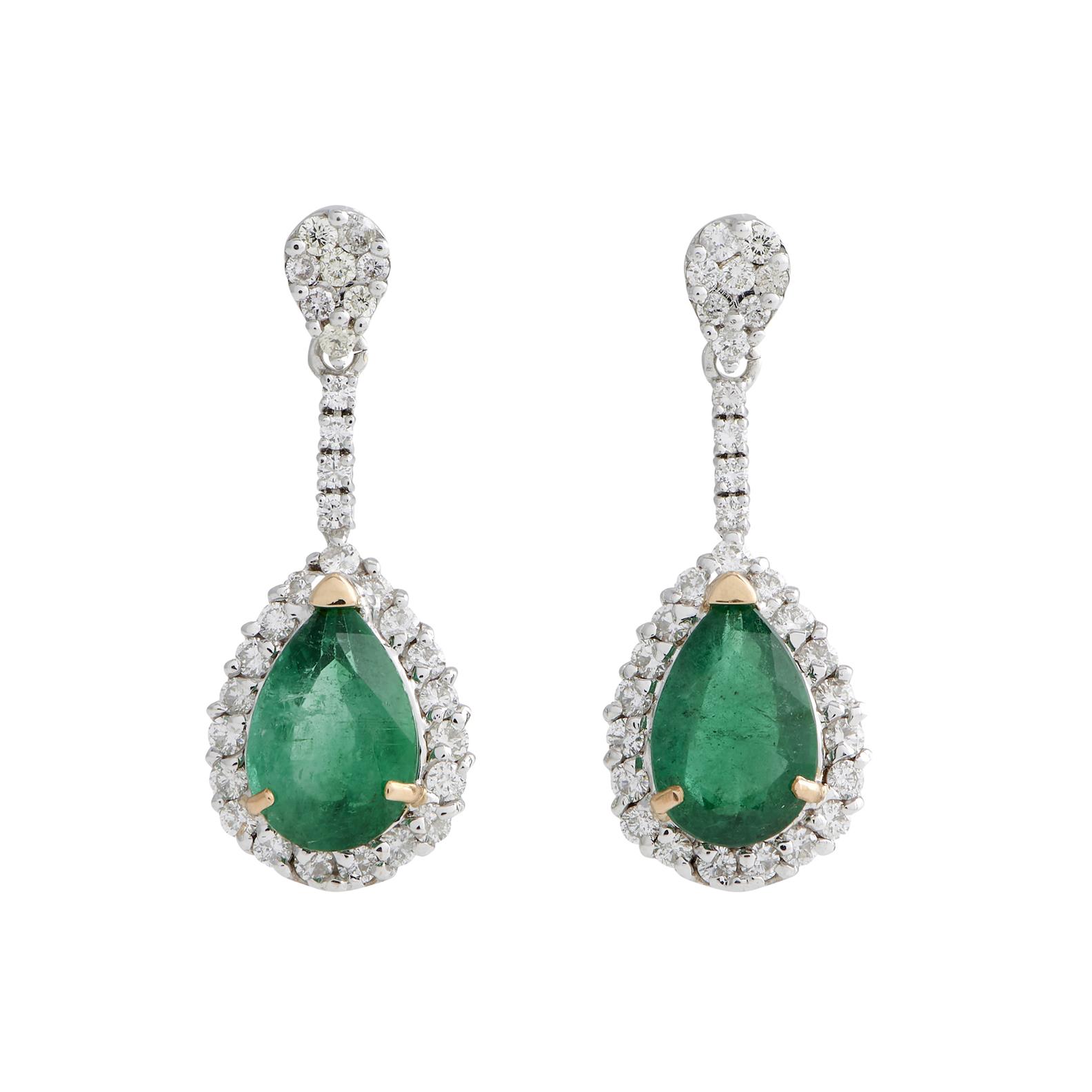 A PAIR OF EMERALD AND DIAMOND EARRINGS IN 18CT TWO-TONE GOLD, THE EMERALDS TOTALLING 8.81CTS, WITH DIAMONDS TOTALLING 3.35CTS, TO POST AND BUTTERFLY FITTINGS, 37MM, ACCOMPANIED BY GEMSTONE REPORT NUMBER GEM2022091271521
