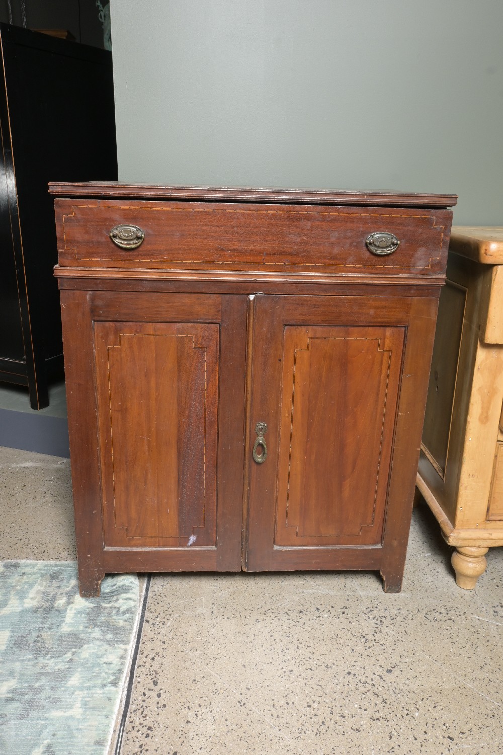 A SMALL ANTIQUE CABINET WITH STRING INLAY (A/F) (PLEASE NOTE THIS HEAVY ITEM MUST BE REMOVED BY CARRIERS AT THE CUSTOMER'S EXPENSE. LEONARD JOEL STAFF CANNOT ASSIST CARRYING THIS ITEM) (X-LARGE)