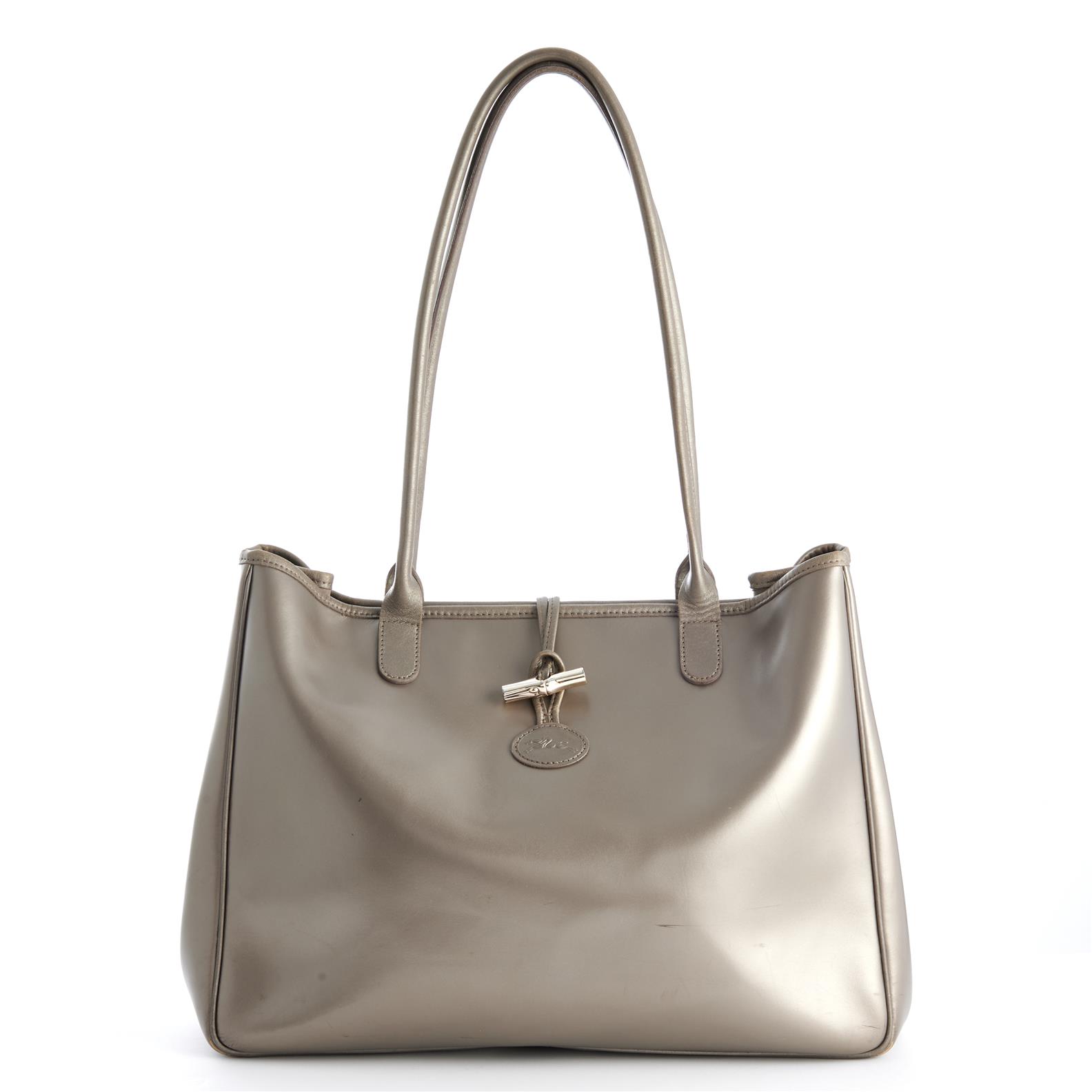 LONGCHAMP, A TOTE BAG STYLED IN A METALLIC GREY WITH CONFORMING STRAPS AND SILVER TONE HARDWARE, 29 X 39 X 12CM