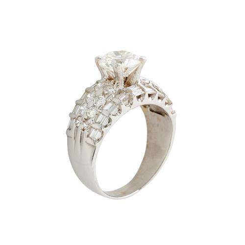 Centring a claw-set brilliant-cut diamond weighing 1.25 carats, on a wide band set with brilliant and baguette-cut diamonds together weighing approximately 1.70 carats, size L.