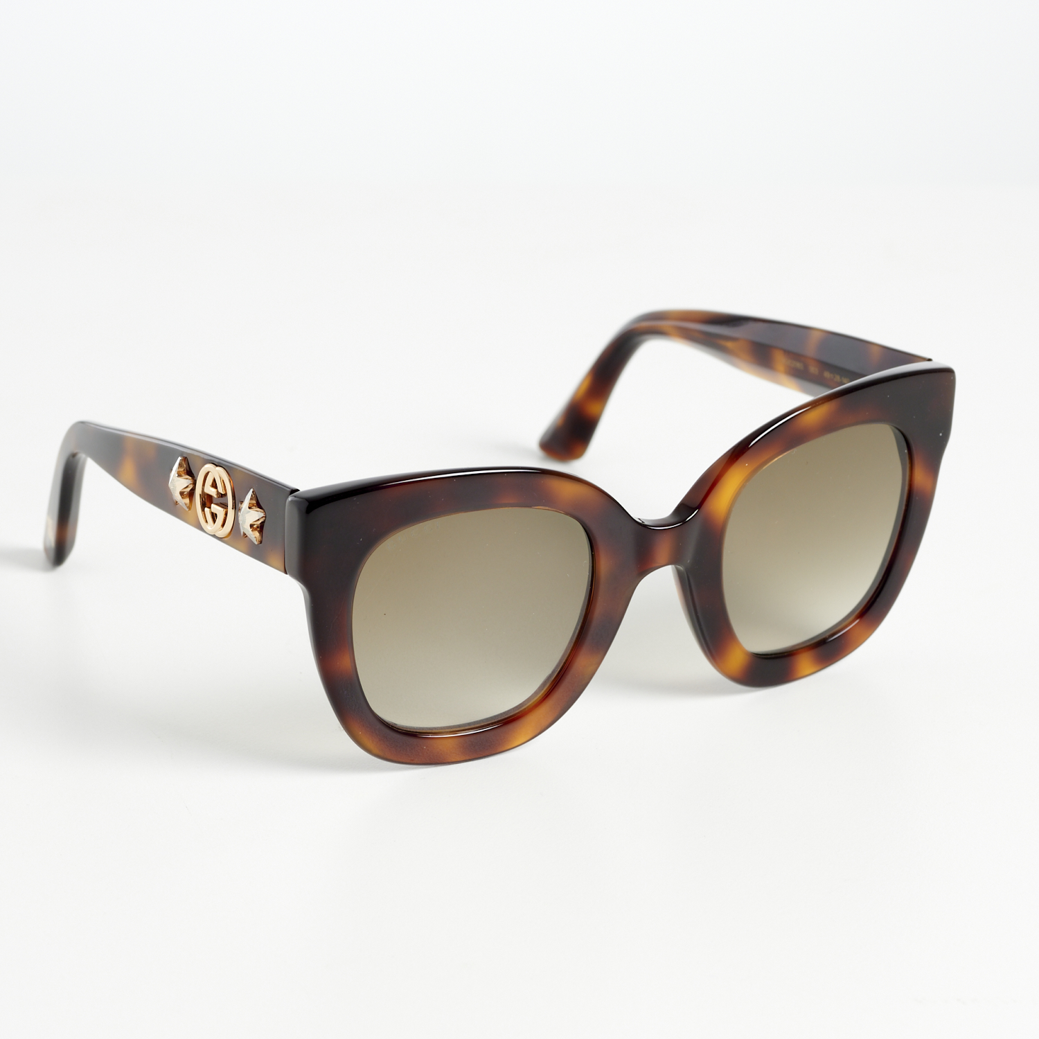 GUCCI, A PAIR OF SUNGLASSES STYLED IN A TORTOISE SHELL COMPOSITE WITH GOLD TONE METAL AND GEM DETAILING, ACCOMPANIED BY A BOX