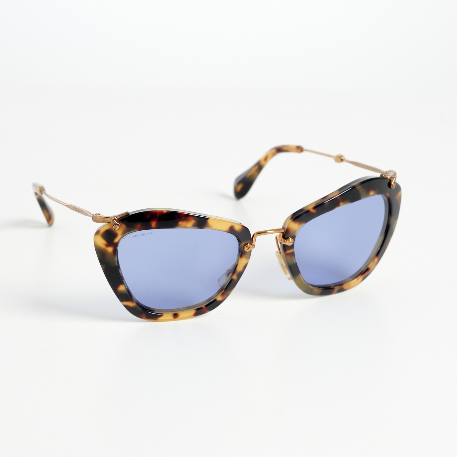 MIU MIU, A PAIR OF SUNGLASSES STYLED IN TORTOISE SHELL COMPOSITE WITH BLUE LENSES AND GOLD TONE METAL