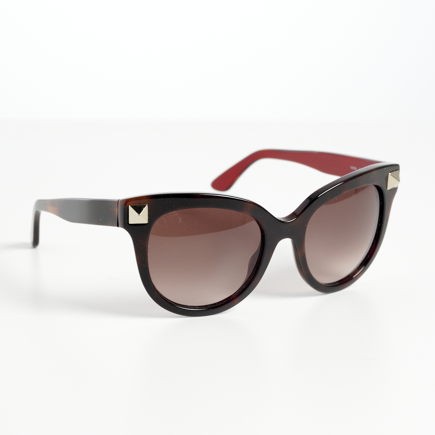 VALENTINO, A PAIR OF SUNGLASSES IN TORTOISE SHELL COMPOSITE WITH RED COMPOSITE INTERIOR AND SILVER TONE STUD DETAILING