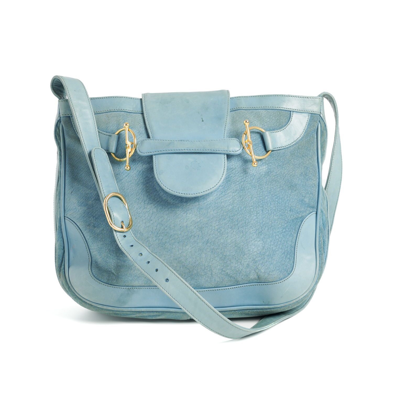 GUCCI, A VINTAGE HANDBAG IN BLUE NUBUCK WITH BLUE LEATHER TRIM AND GOLD TONE HARDWARE, 25 X 29 X 6CM, A/F