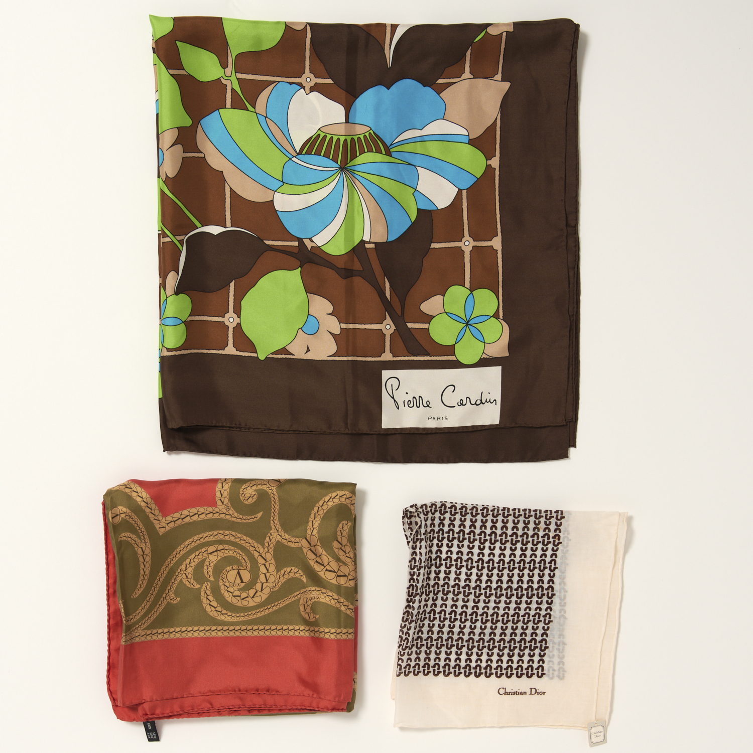 A COLLECTION OF ACCESSORIES INCLUDING A PIERRE CARDIN AND VALENTINO VINTAGE SILK SCARF, TOGETHER WITH A CHRISTIAN DIOR HANKERCHIEF IN COTTON