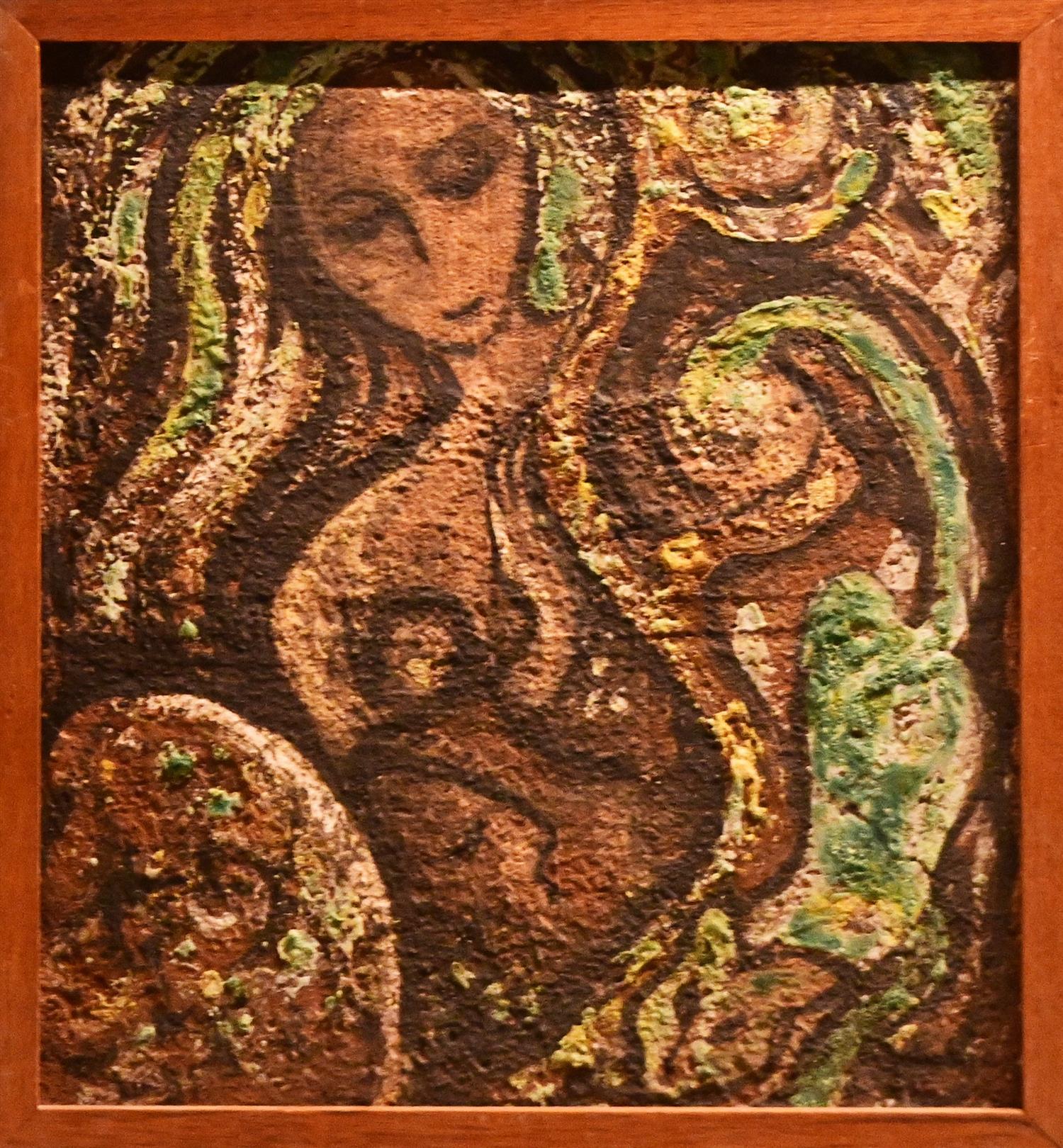 LUCY BOYD BECK, ISABELLA WITH CAT, PAINTED CERAMIC, UNSIGNED, TITLED ON LABEL VERSO, 42.5 X 39.5CM, FRAME SIZE: 47 X 44CM