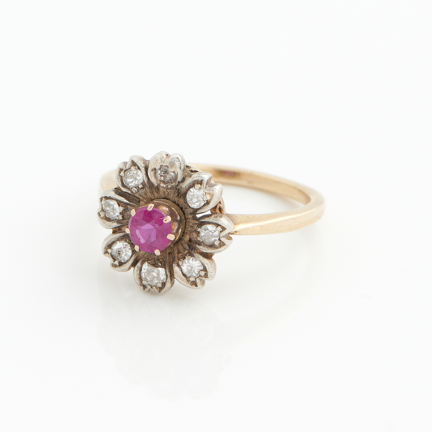 AN ANTIQUE SYNTHETIC RUBY AND DIAMOND CLUSTER RING IN 9CT GOLD AND SILVER, SIZE M, 3.1GMS