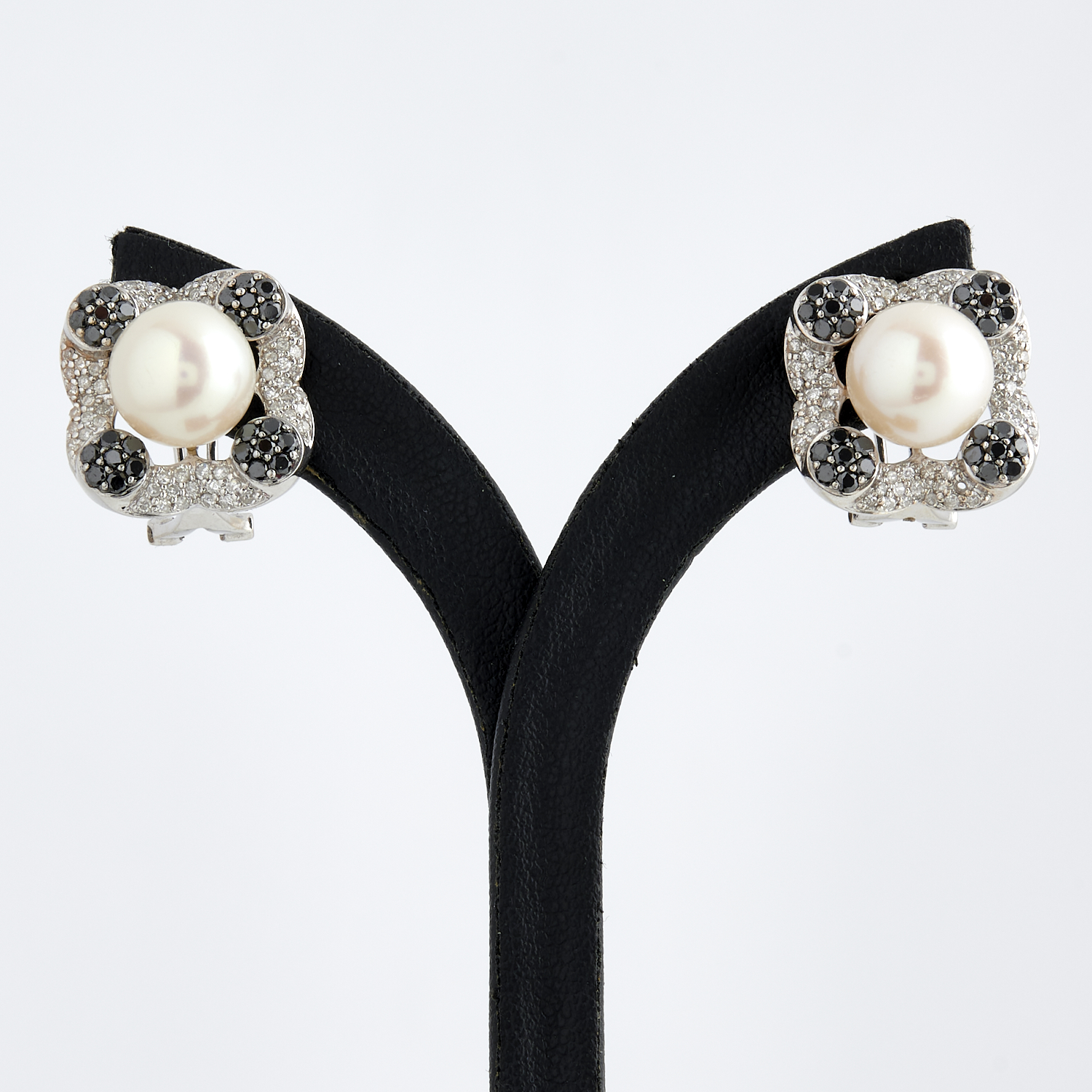 A PAIR OF PEARL, BLACK DIAMOND AND DIAMOND EARRINGS IN 18CT WHITE GOLD, TO POST AND BUTTERFLY FITTINGS