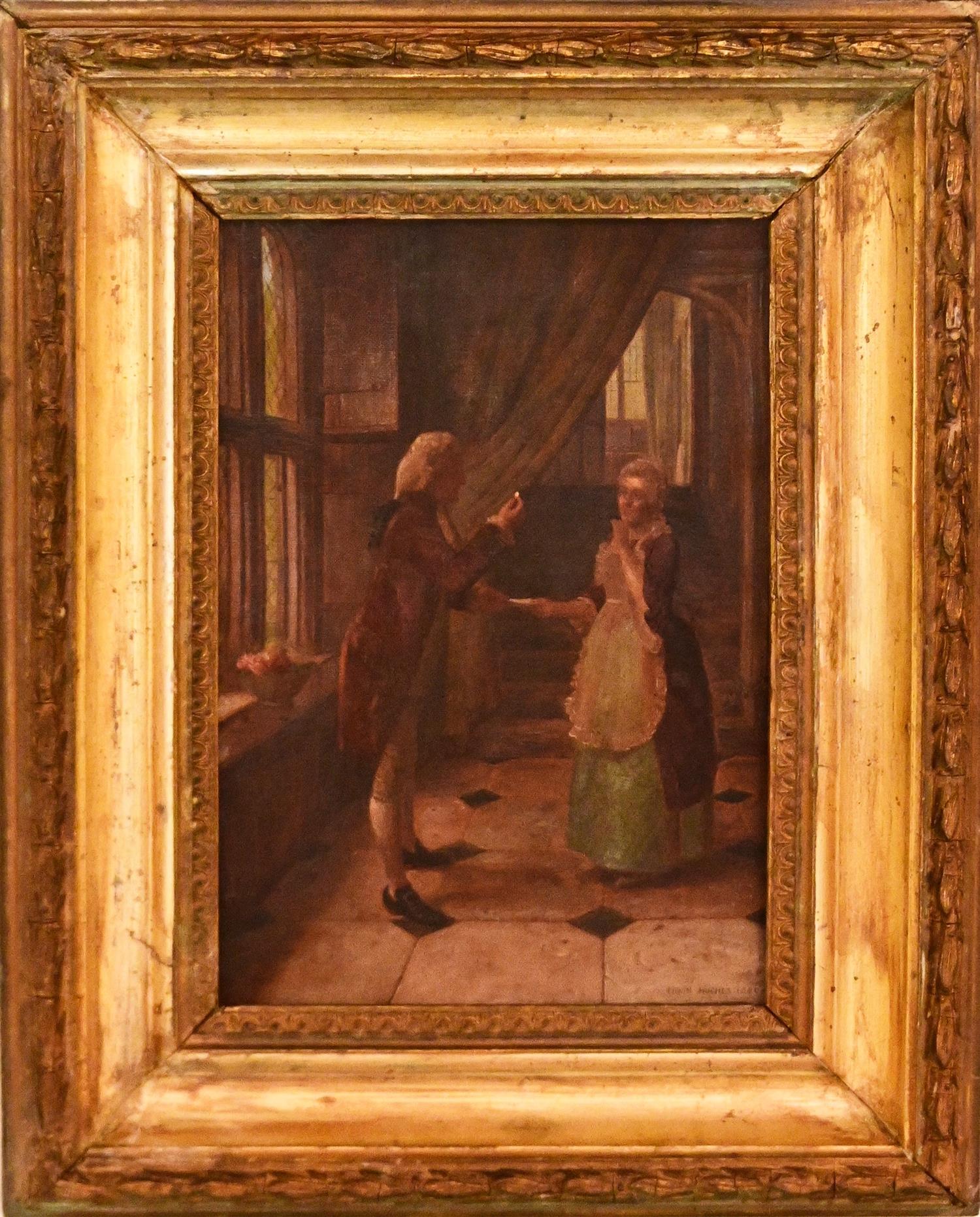 EDWIN HUGHES, TIPPING THE MAID C.1880, OIL ON CANVAS, SIGNED AND DATED LOWER RIGHT, 24.5 X 16.5CM, FRAME SIZE: 38 X 30CM