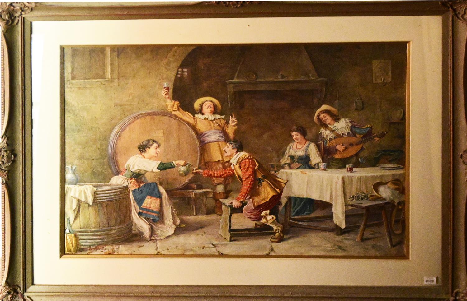 RAPHAEL MORETTI, (TAVERN SCENE), WATERCOLOUR ON PAPER, SIGNED LOWER LEFT, 54 X 75CM, FRAME SIZE: 82 X 104CM