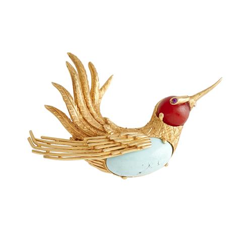 Modelled as an exotic bird, the body set with an oval turquoise cut en cabochon, the head detailed with a circular coral cut en cabochon, with a circular-cut ruby eye, length 32mm, width 50mm, gross weight 12.5mm.