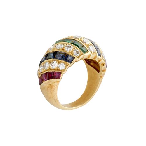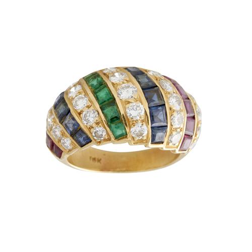 The wide band, set with rows of carre-cut rubies, sapphires and emeralds, each spaced by rows of brilliant-cut diamonds, the diamonds together weighing approximately 0.80 carats, size J 1/2, gross weight 8.2 grams.