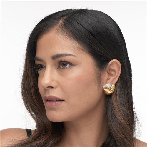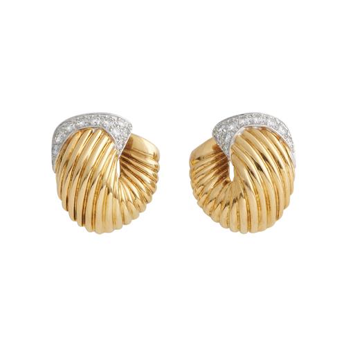Each earring modelled in reeded gold, with brilliant-cut diamond detail, the diamonds together weighing approximately 0.60 carats, to clip fittings, length 25mm, gross weight 22.3 grams.