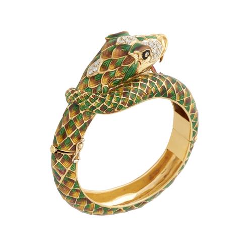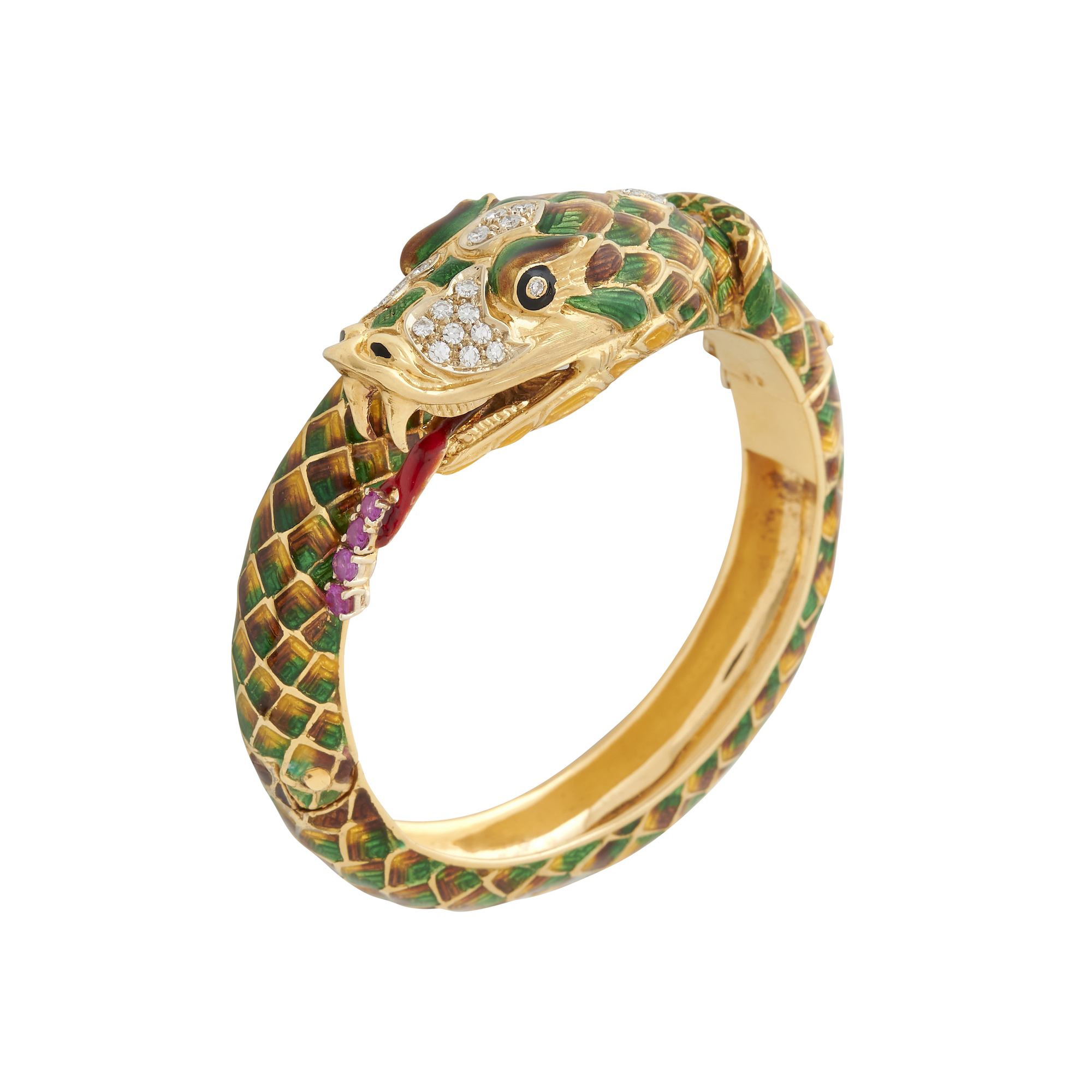 Modelled as a coiled serpent, set throughout with green, brown and yellow enamel, the head decorated with brilliant-cut diamonds together weighing approximately 0.65 carats, the tongue detailed with red enamel and four circular-cut rubies together weighing approximately 0.25 carats, Portuguese marks, inner circumference approximately 165mm, gross weight 95.4 grams.