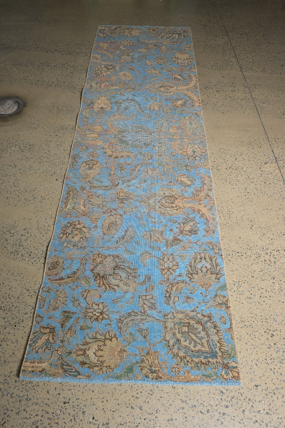 A DECORATIVE CONTEMPORARY OVER-DYED PERSIAN TABRIZ RUNNER. 100% WOOL, ANTIQUE WASH, ALL-OVER DESIGN OF PALMETTES AND FLORAL SPRAYS. THE PILE IS ANTIQUE WASHED AND OVER-DYED IN BEAUTIFUL COLOURS OF CHOCOLATE BROWN, TAN AND FRENCH BLUE, WITH EMERALD HIGH LIGHTS. SIZE: 304 X 84 CM ORIGIN: PERSIA - RRP: $800 DOCUMENTATION OF AUTHENTICITY INCLUDED.
