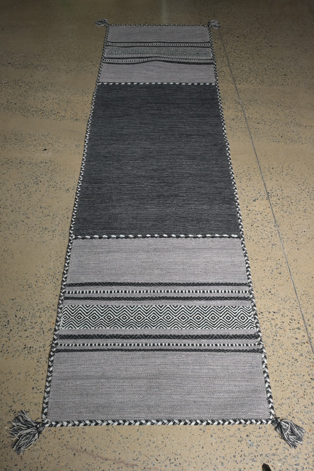 A NEW LARGE COLOURFUL, DENSELY HAND- WOVEN RAJASTHANI KILIM RUNNER. V'ERY DURABLE AND SOFT TO WALK ON, REVERSABLE. MADE FROM THE FINEST COTTON FLEECE. IN GREY, CHARCOAL AND SILVER TONES. SIZE: 300 X 80 CM-ORIGIN: JAIPUR – RRP: $350