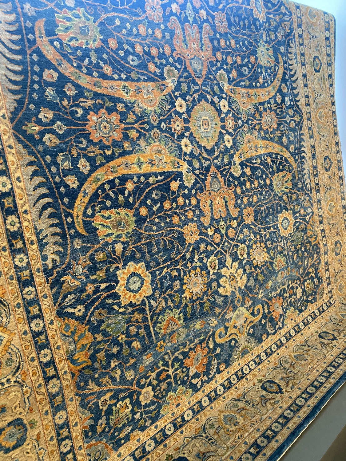 AN OUTSTANDING, NEW 16th CENTURY-STYLE FARHAN DESIGN RUG. 100% FINELY HAND SPUN WOOL, NATURAL DYES. SUPERBLY HAND KNOTTED WITH A VERY DENSE PILE. ALL OVER LARGE ROSETTES, PALMETTES AND FLORAL SPRAYS IN MELLOW TONES WITH APRICOT HIGHLIGHTS, ON A RICH BLUE FIELD. ANTIQUE STYLE BORDER OF PALMETTES AND ROSETTES. . SIZE: 250 X 302 CM ORIGIN: AGRA – RRP: $9,500 CONDITION: EXCELLENT CONDITION, EX GALLERY. DOCUMENTATION OF AUTHENTICITY INCLUDED