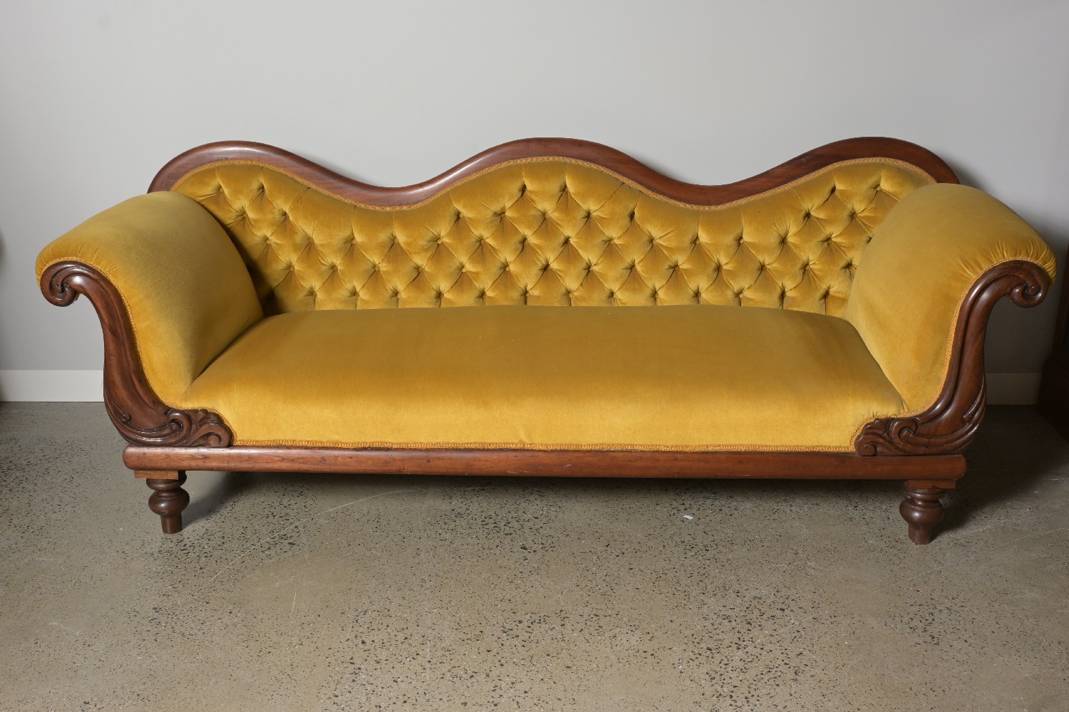 A VICTORIAN AUSTRALIAN CEDAR AND UPHOLSTERED SOFA (82H X 221W X 70D CM) (PLEASE NOTE THIS HEAVY ITEM MUST BE REMOVED BY CARRIERS AT THE CUSTOMER'S EXPENSE. LEONARD JOEL STAFF CANNOT ASSIST CARRYING THIS ITEM) (X-LARGE)