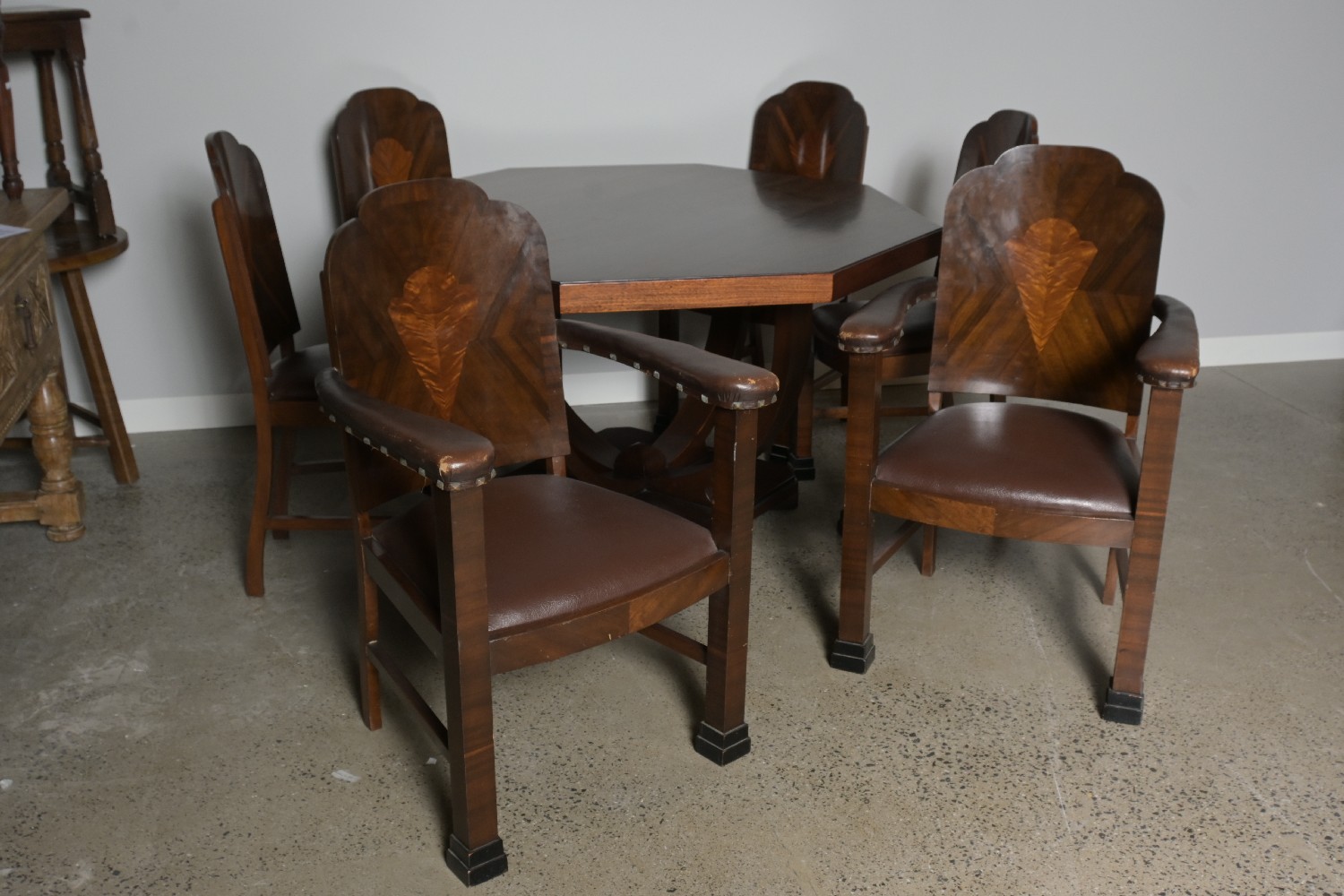 AN ART DECO WALNUT OCTAGONAL FORM HOOP BASED DINING TABLE WITH SIX MATCHED INLAID CHAIRS INCLUDING 2 CARVERS (H77 X 127DIA CM) (PLEASE NOTE THIS HEAVY ITEM MUST BE REMOVED BY CARRIERS AT THE CUSTOMER'S EXPENSE. LEONARD JOEL STAFF CANNOT ASSIST CARRYING THIS ITEM) (X-LARGE)