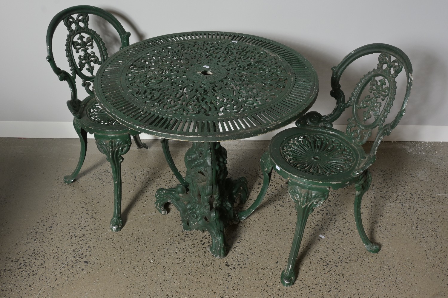 A VICTORIAN-STYLE THREE-PIECE GARDEN SUITE OF A TABLE AND TWO CHAIRS (H68 X D76) (LEONARD JOEL DELIVERY: X-LARGE)
