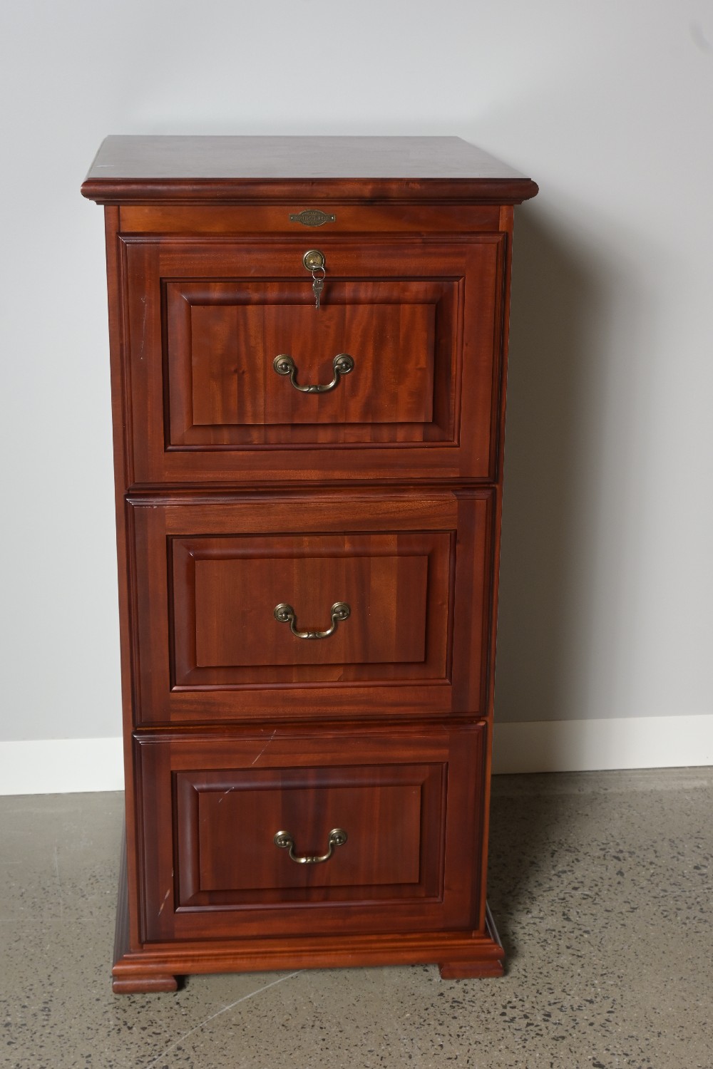 A BRIDGETON MAHOGANY THREE-DRAWER FILING CABINET (H112 X W55 X D58 CM) (L'EONARD JOEL DELIVERY: X-LARGE)