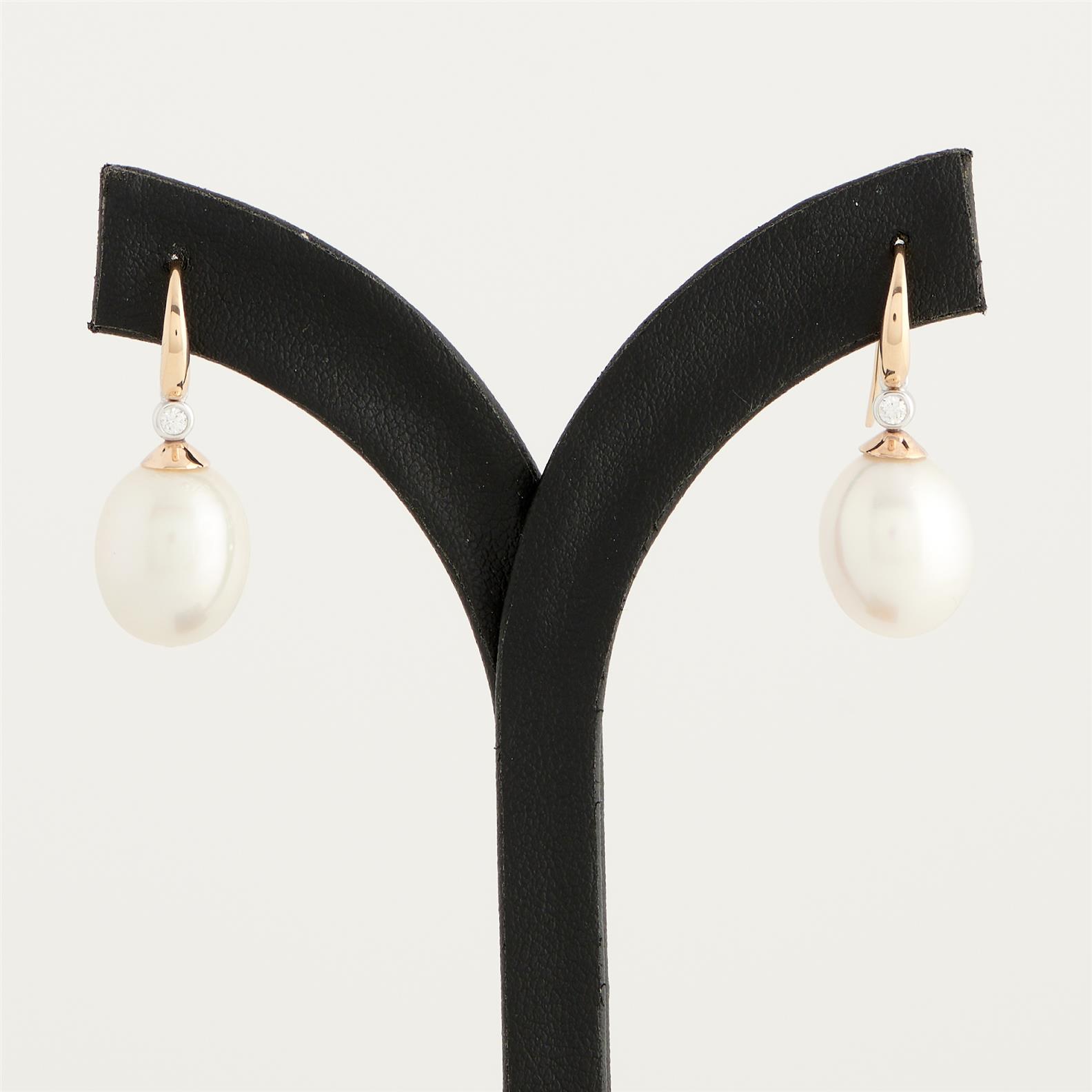 A PAIR OF SOUTH SEA PEARL AND DIAMOND EARRINGS IN 14CT GOLD, TO SHEPHERD HOOK FITTINGS, THE PEARLS MEASURING 12.7 X 16MM