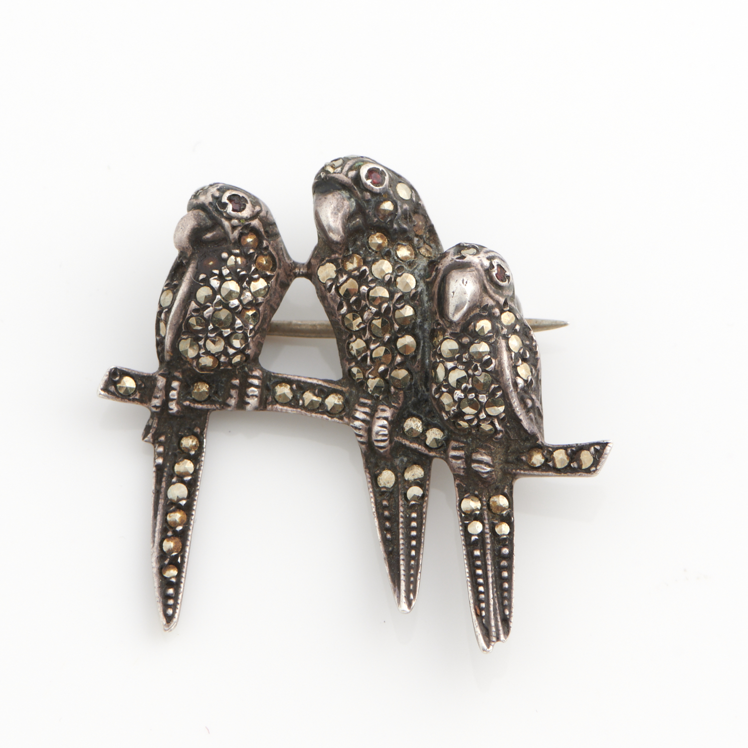 A MARCASITE SET PARROTS BROOCH IN STERLING SILVER, 26MM X 29MM