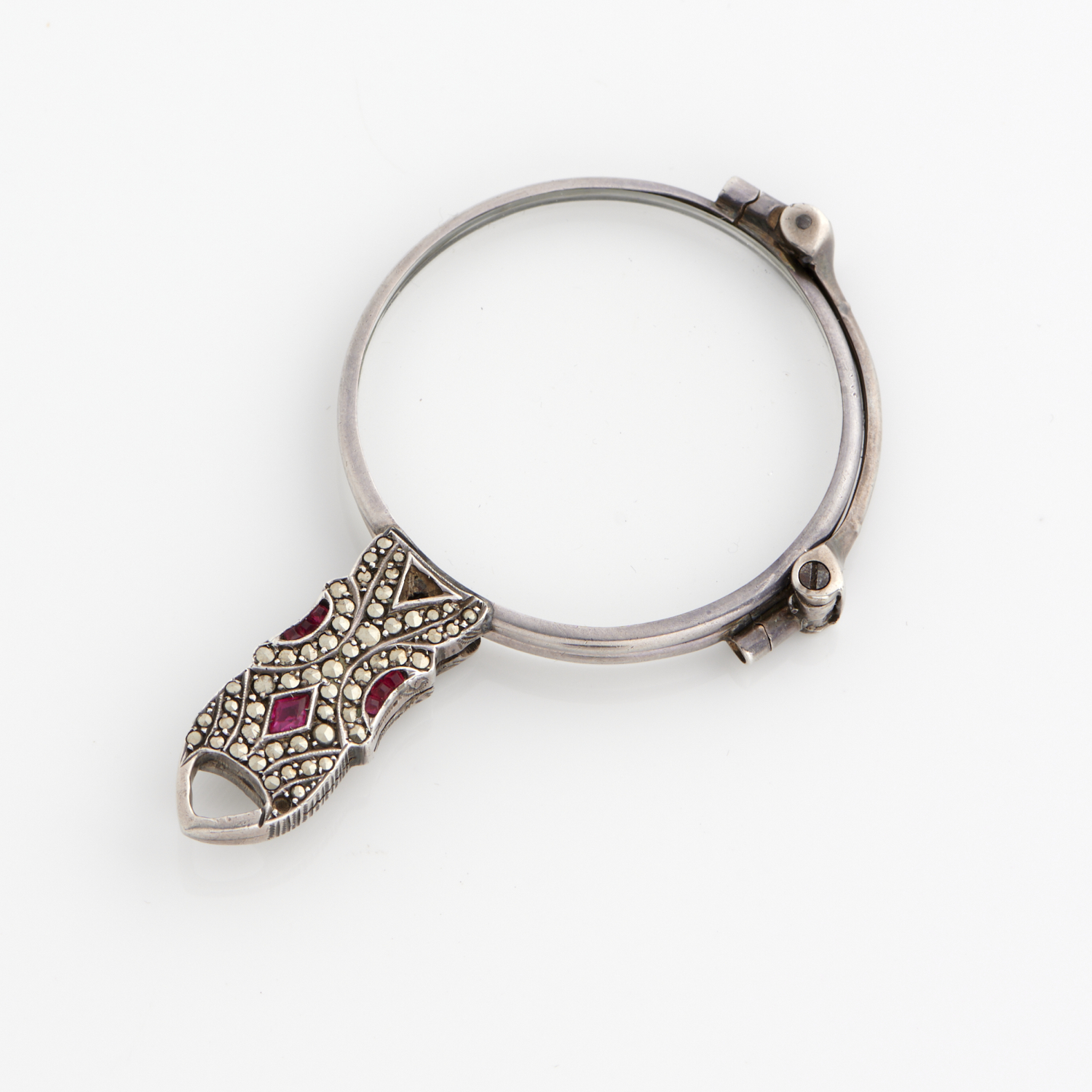 AN ANTIQUE ENGRAVED MARCASITE AND GEM SET LORGNETTE IN SILVER