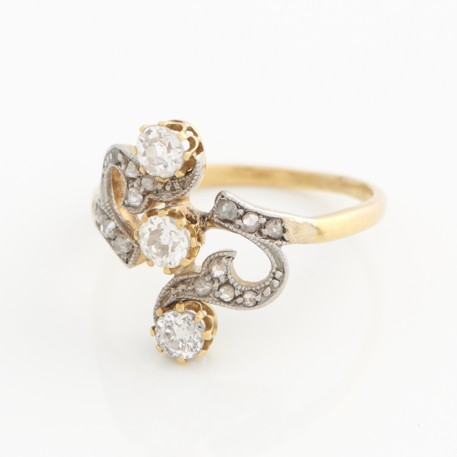 A DIAMOND SET CROSSOVER RING IN 18CT GOLD, RETAILED BY KOZMINSKY, THE DIAMONDS TOTALLING 0.40CTS, SIZE L/M, BOXED