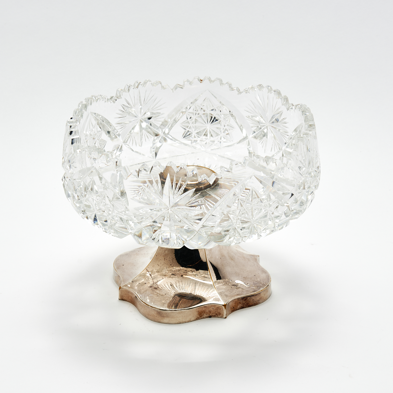 AN EARLY 20TH CENTURY GERMAN WMF CUT CRYSTAL CENTRE BOWL ON SILVER PLATE BASE H.16CM, LEONARD JOEL DELIVERY SIZE: SMALL