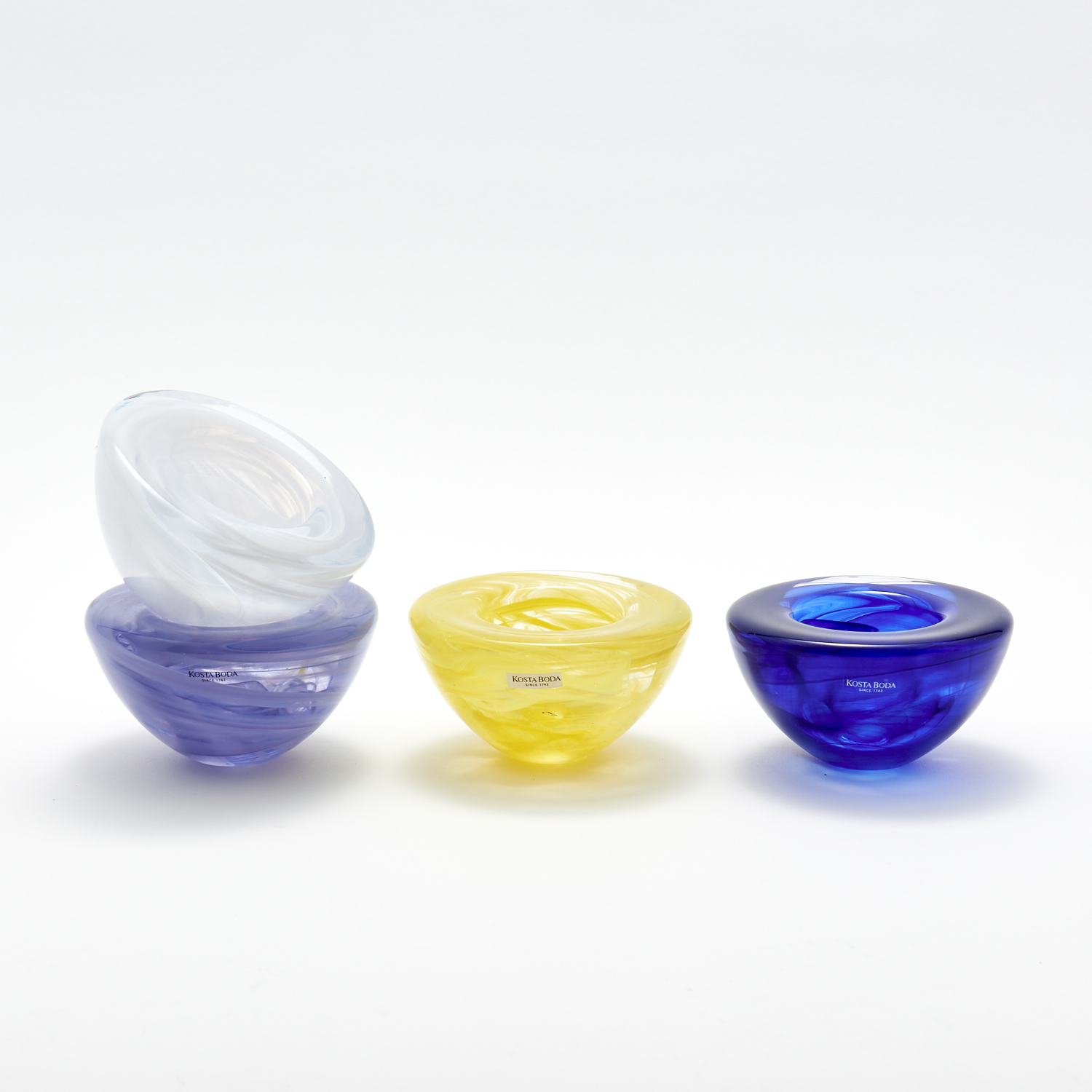 A HARLEQUIN SET OF FOUR SIGNED AND STICKERED KOSTA BODA GLASS BOWLS DIA.11.5CM (EACH), LEONARD JOEL DELIVERY SIZE: SMALL