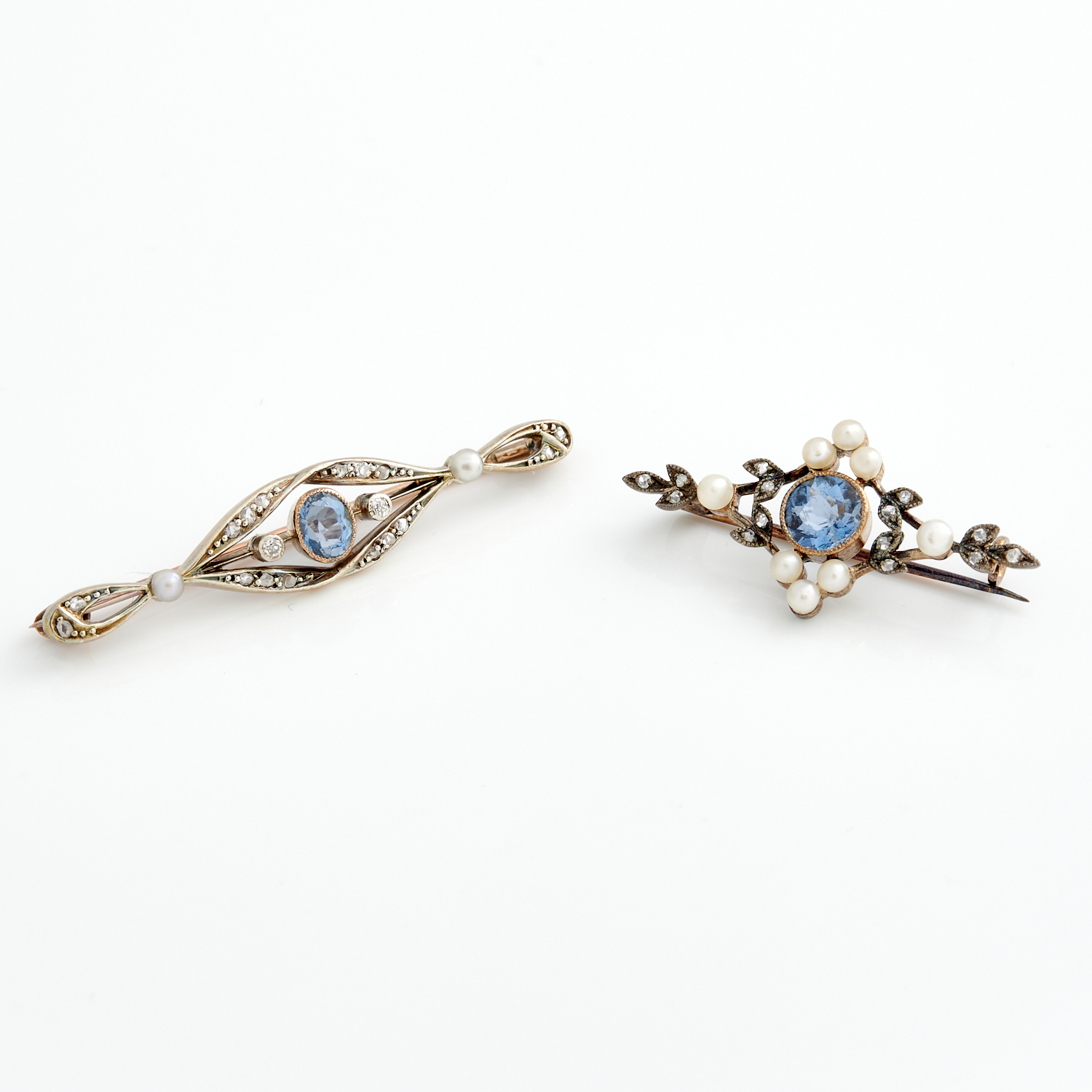 TWO GEM-SET, SEED PEARL AND DIAMOND BROOCHES, ONE IN 9CT GOLD AND ONE IN GOLD PLATE