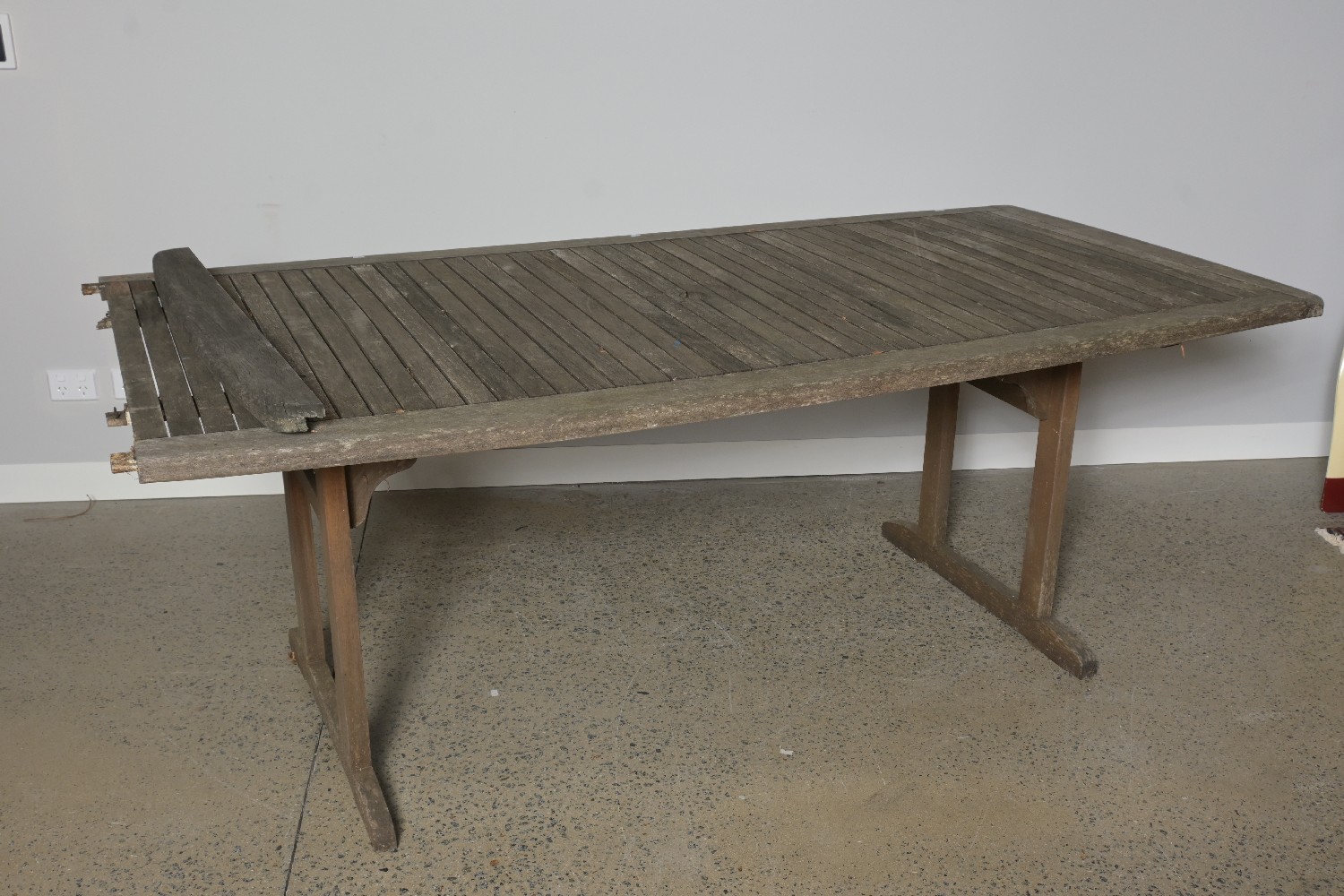 A TEAK OUTDOOR TABLE (A/F) (H74 X W220 X D96 CM) (PLEASE NOTE THIS HEAVY ITEM MUST BE REMOVED BY CARRIERS AT THE CUSTOMER'S EXPENSE. LEONARD JOEL STAFF CANNOT ASSIST CARRYING THIS ITEM) (X-LARGE ITEM)