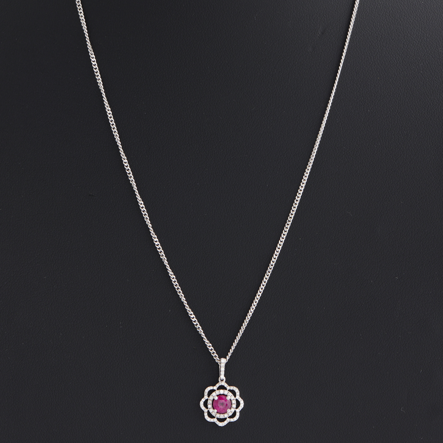 A RUBY AND DIAMOND PENDANT TO A CHAIN IN 18CT WHITE GOLD, 480MM, 5.6GMS