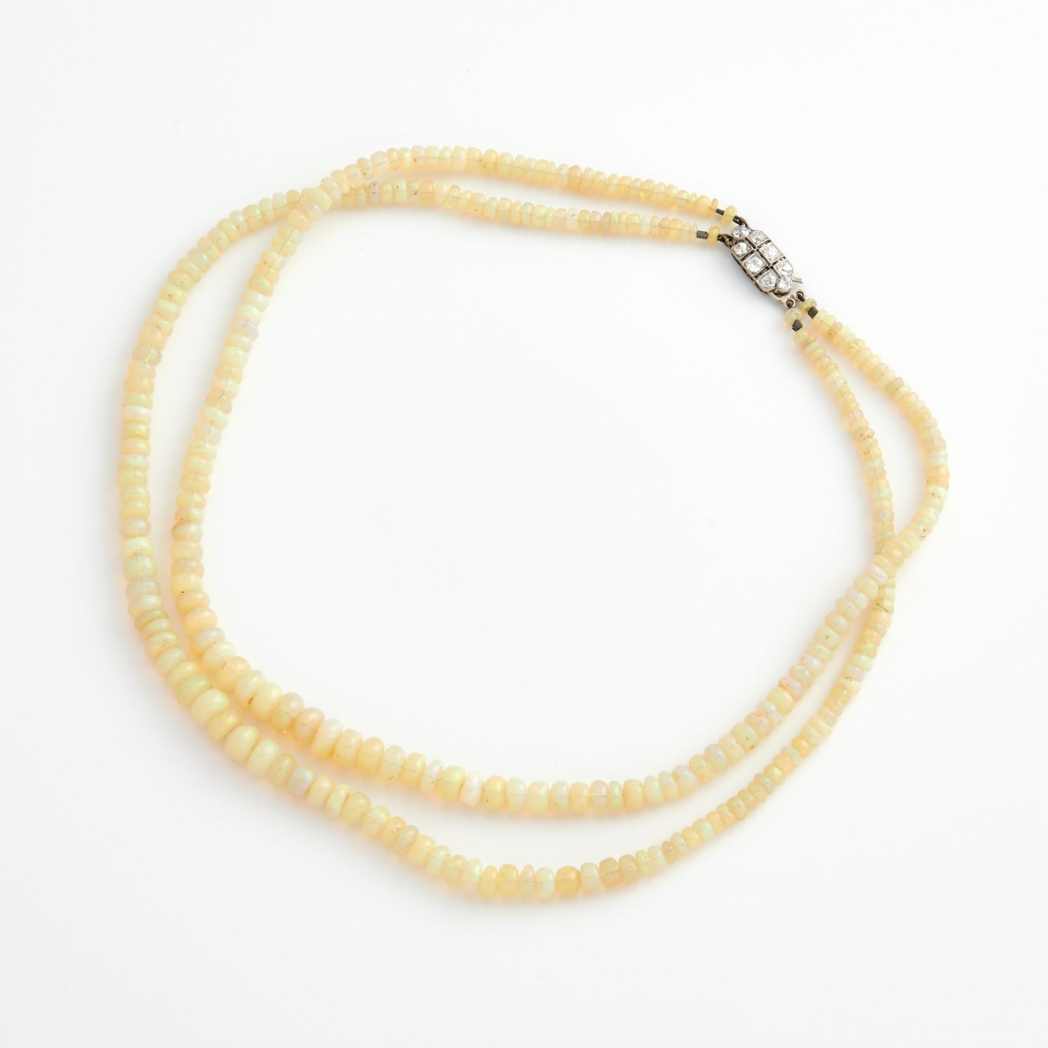 A DOUBLE STRAND OPAL BEAD NECKLACE TO A DIAMOND SET CLASP IN 18CT WHITE GOLD, RETAILED BY THE FRENCH JEWEL BOX, 390MM