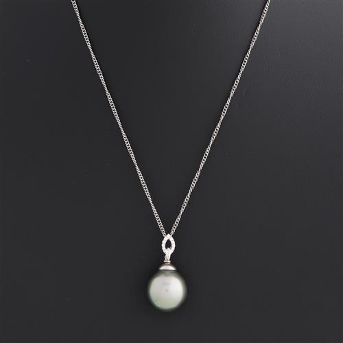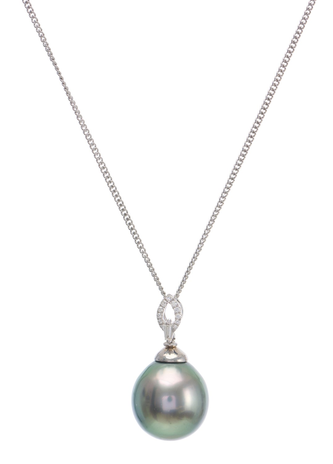 The pendant presents in excellent, as new condition. Pearl has an excellent lustre, with some small blemishes to skins. Diamonds totalling 0.18cts. Total length 30mm. Display chain only.