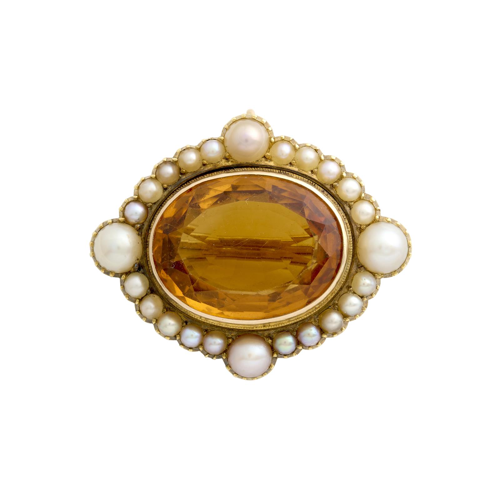Centring an oval citrine weighing approximately 11.00 - 12.00 carats, within a frame of pearls, mounted in 15ct gold, length 33mm, width 27mm, gross weight approximately 9.6 grams.