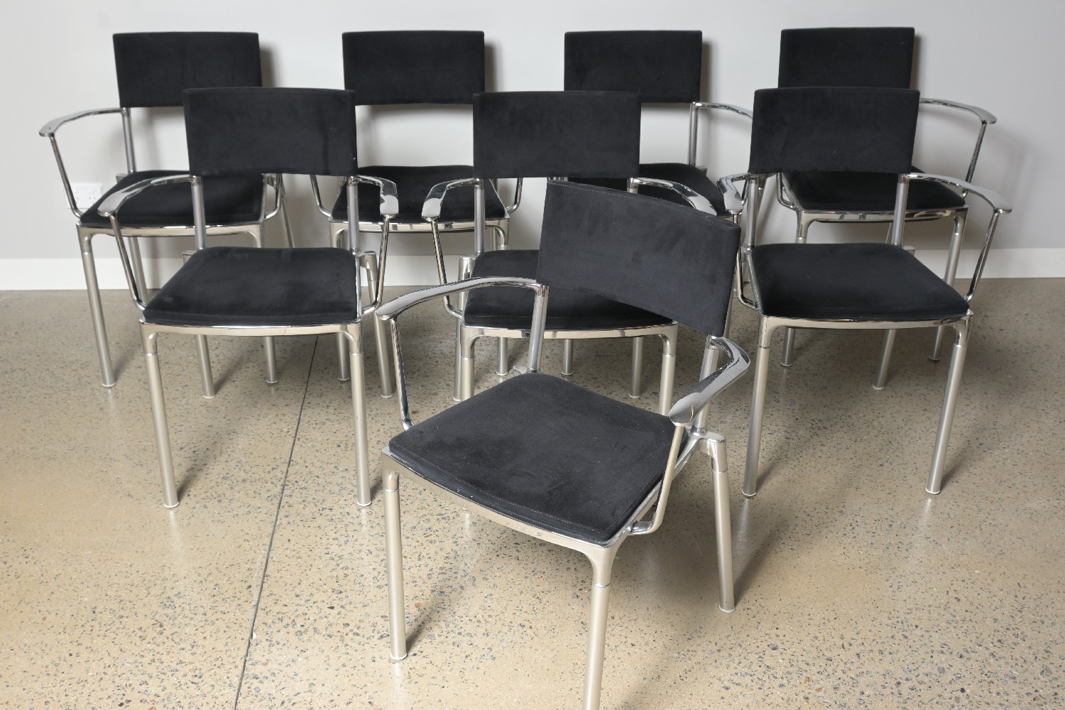 A SET OF EIGHT CHROME DINING CHAIRS WITH VELVET SEATS (80H X 60W X 53D CM) ('LEONARD JOEL DELIVERY: X-LARGE)