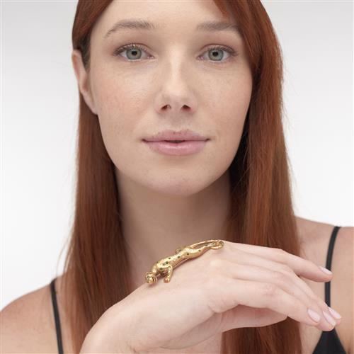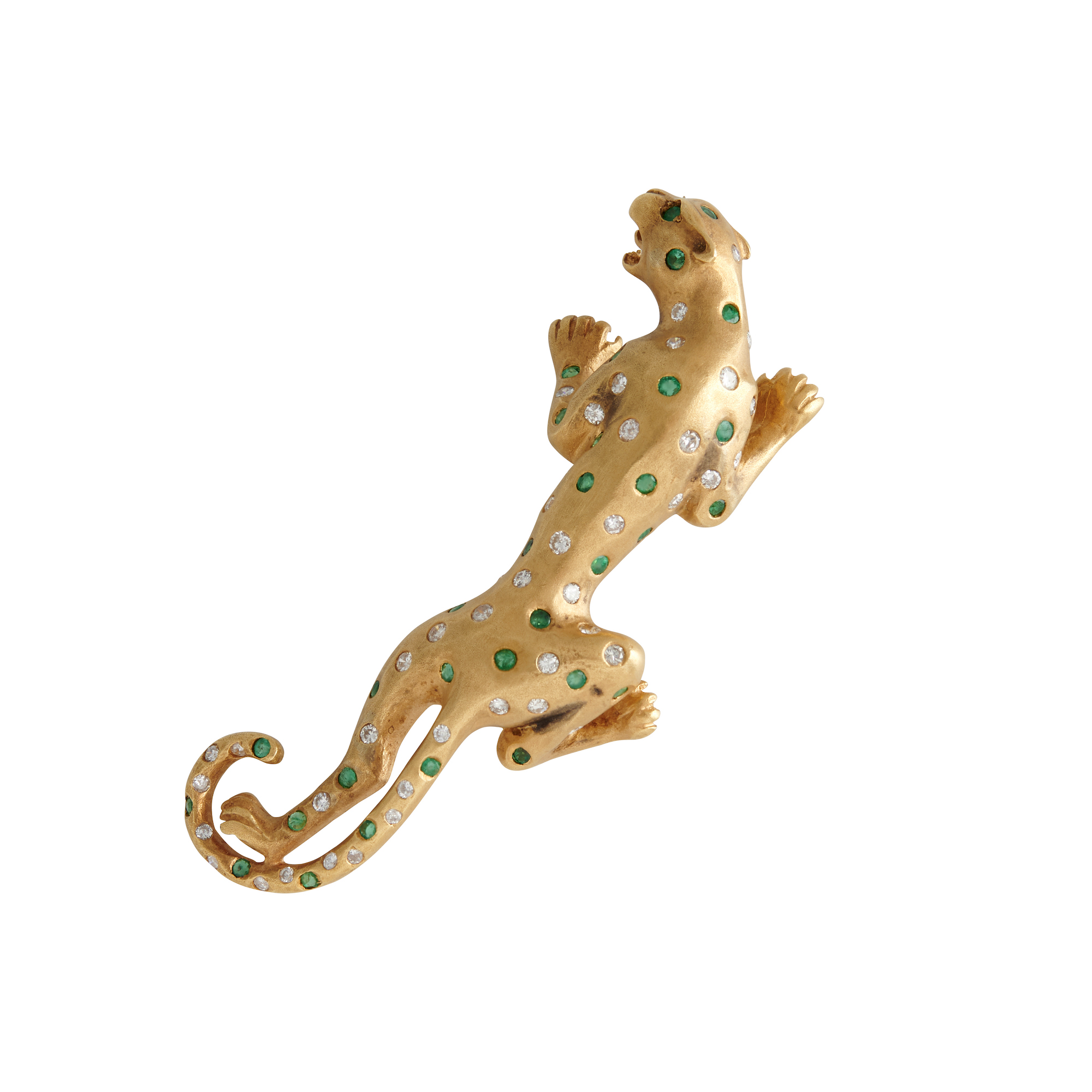 Modelled as a panther, the body detailed with hammer-set brilliant-cut diamonds and circular-cut emeralds, length 22mm, width 60mm, gross weight 14.1 grams.