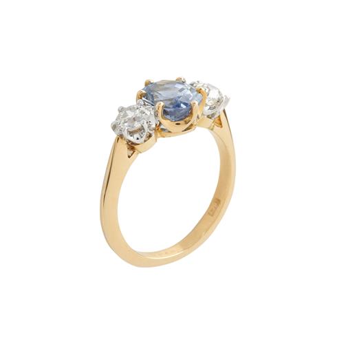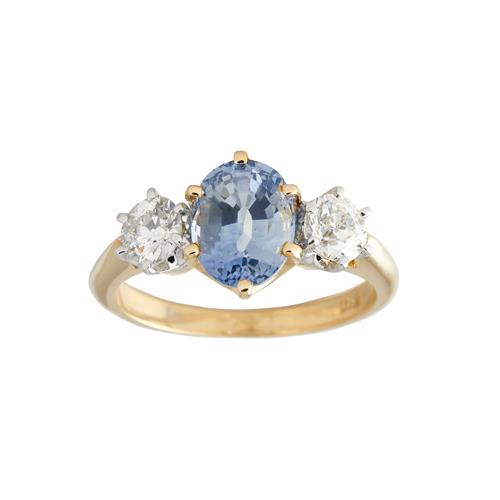 A SAPPHIRE AND DIAMOND RING IN 18CT TWO TONE GOLD, THE SAPPHIRE WEIGHING APPROXIMATELY 2.50CTS, WITH DIAMONDS TOTALLING 0.73CTS, SIZE P