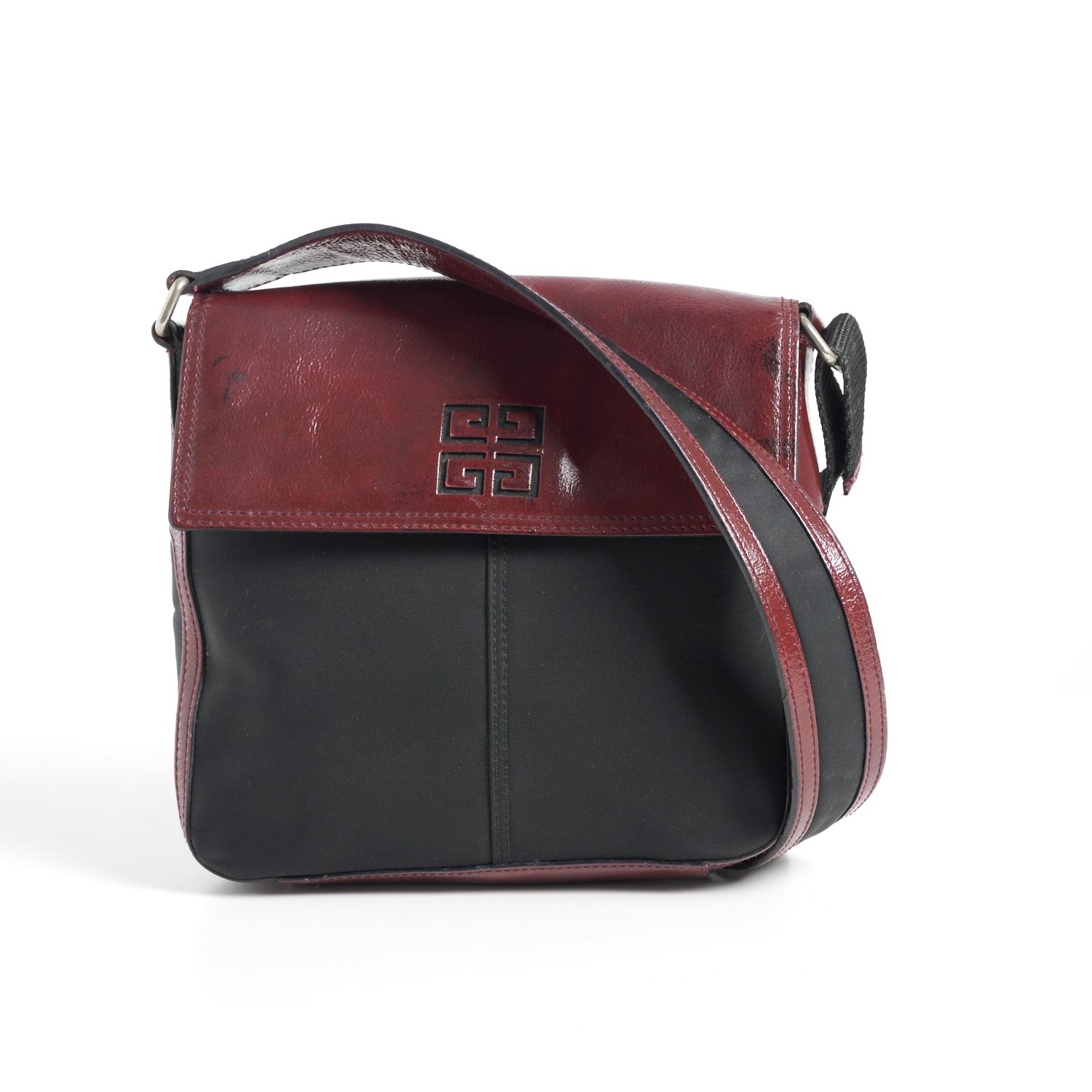 GIVENCHY, A SATCHEL STYLED IN BLACK CANVAS WITH PATENT MAROON LEATHER TRIM AND MAGNETIC CLOSURE, TO A CONFORMING SHOULDER STRAP, 20 X 20 X 4CM