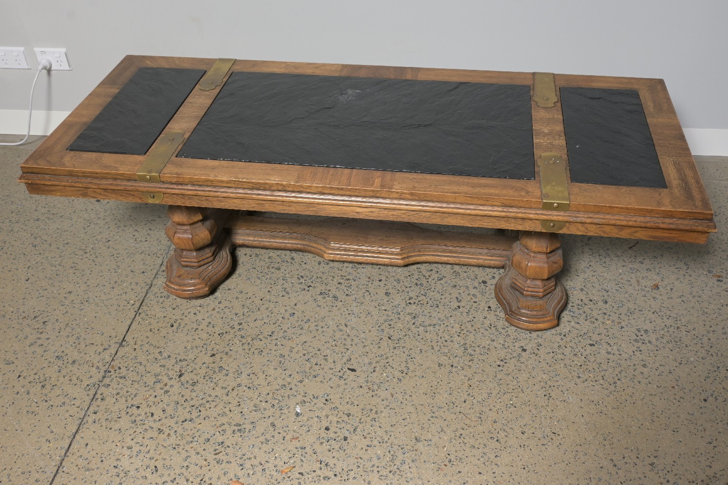 A SUBSTANTIAL FRENCH STYLE COFFEE TABLE WITH SLATE INSETS (A/F) (44H X 155W X 64D CM) (PLEASE NOTE THIS HEAVY ITEM MUST BE REMOVED BY CARRIERS AT THE CUSTOMER'S EXPENSE. LEONARD JOEL STAFF CANNOT ASSIST CARRYING THIS ITEM) (X-LARGE)