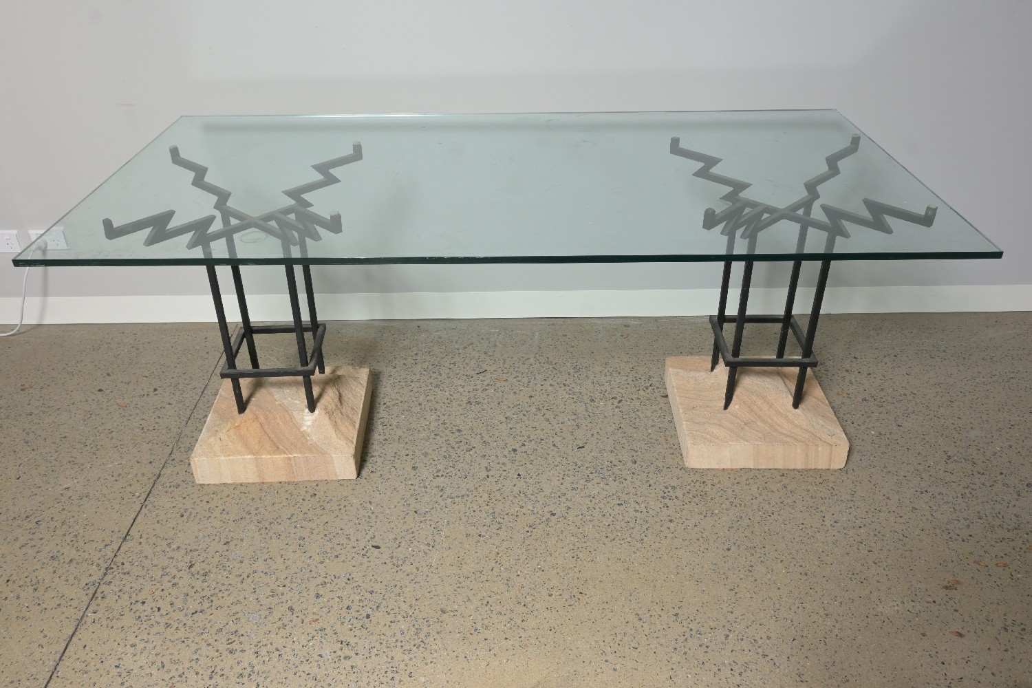A STEEL & STONE BASED DINING TABLE WITH GLASS TOP (A/F) (73H X 180W X 90D 'CM) (PLEASE NOTE THIS HEAVY ITEM MUST BE REMOVED BY CARRIERS AT THE CUSTOMER'S EXPENSE. LEONARD JOEL STAFF CANNOT ASSIST CARRYING THIS ITEM) (X-LARGE)