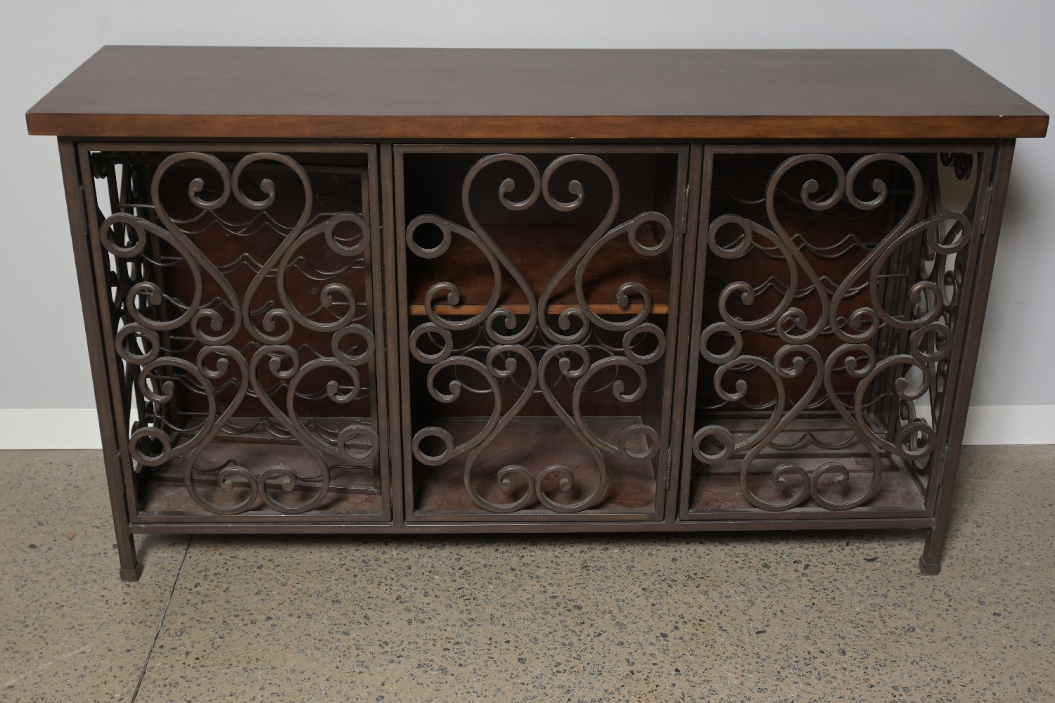 AN ORNATE METAL & TIMBER SIDEBOARD WITH INTERNAL SHELVING (92H X 163W' X 49D CM) (PLEASE NOTE THIS HEAVY ITEM MUST BE REMOVED BY CARRIERS AT THE CUSTOMER'S EXPENSE. LEONARD JOEL STAFF CANNOT ASSIST CARRYING THIS ITEM) (X-LARGE)