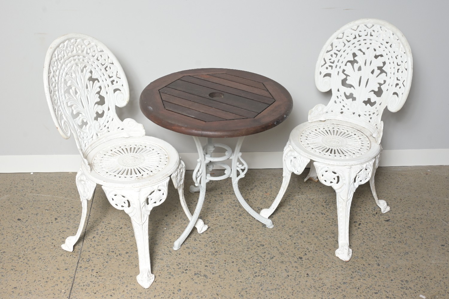 A CAST IRON THREE PIECE OUTDOOR SETTING, TABLE WITH WOODEN TOP (63H X 60D) (LEONARD JOEL DELIVERY: X-LARGE)
