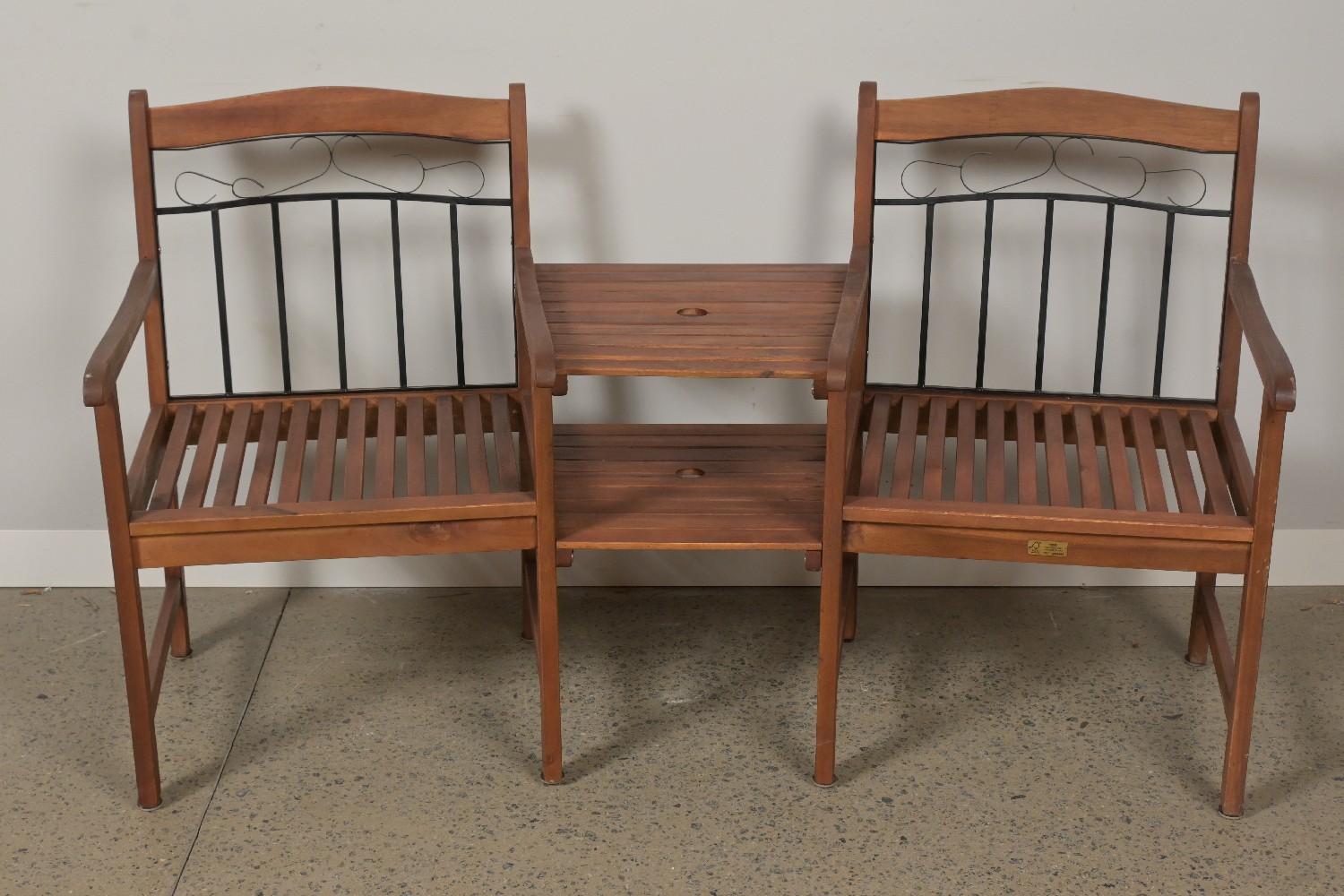 A TWO SEAT GARDEN SEAT WITH CENTRAL TABLE (86H X 162W X 62D CM) (LEONARD JOEL DELIVERY: X-LARGE)