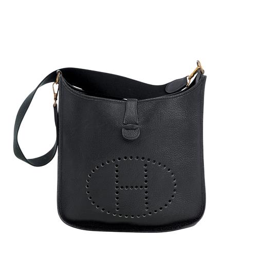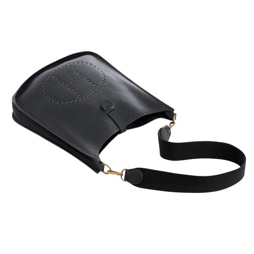 Styled in black Clemence with detachable conforming grosgrain shoulder strap and gold tone hardware, 34 x 32 x 8cm.