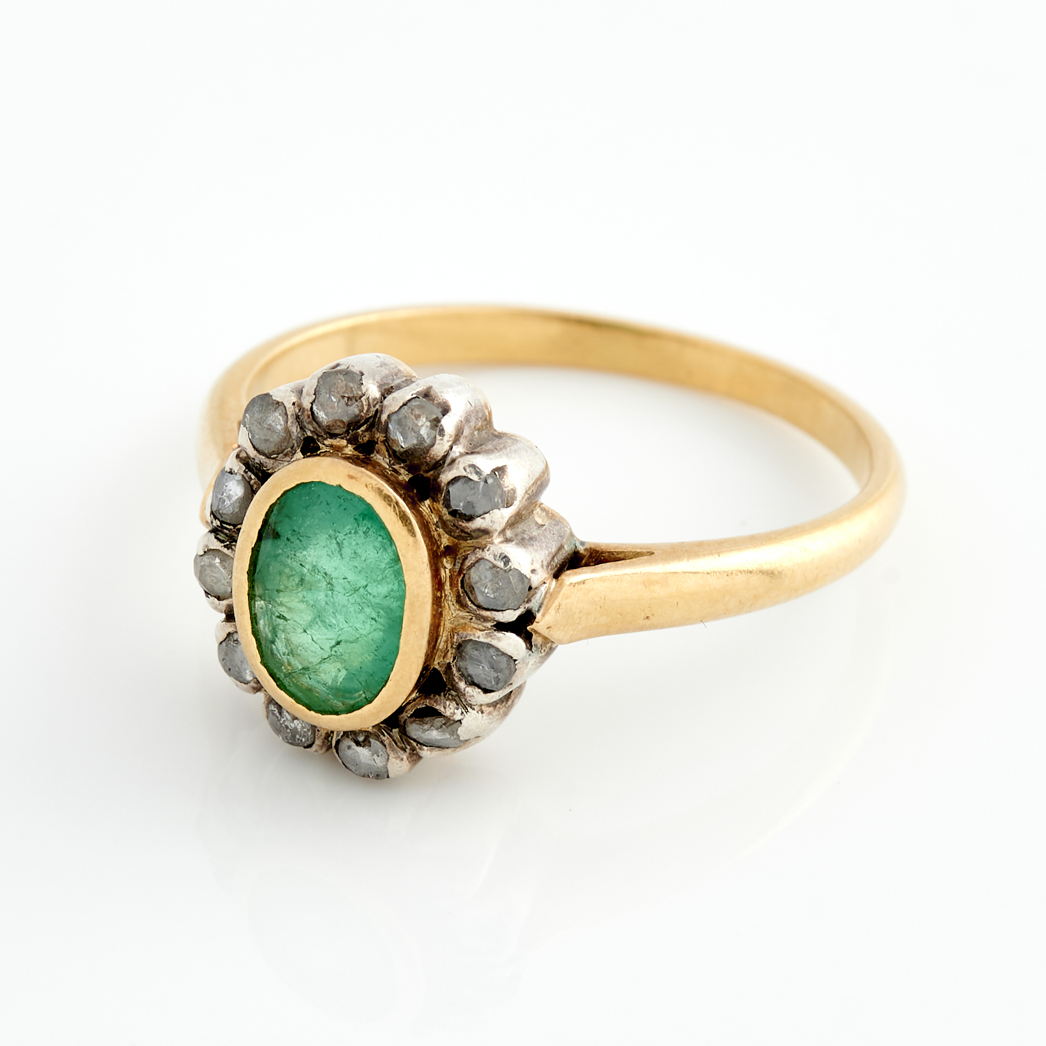 AN EMERALD AND DIAMOND RING IN 18CT GOLD, SIZE P, 4.2GMS