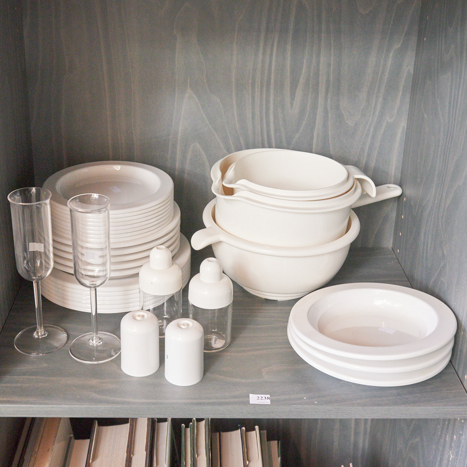 A COLLECTION OF WHITE MELAMITE KITCHANLIA BY GUZZINI INCLUDING COLANDERS, BOWLS, PLATES CRUETS, AND FLUTES DIA.24CM (COLANDER) LEONARD JOEL DELIVERY SIZE: LARGE