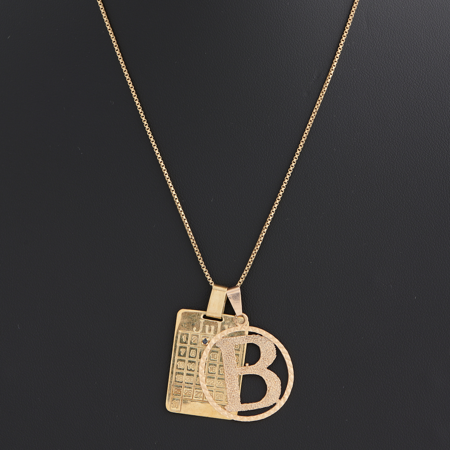 A 'B' PENDANT TO A FINE BOX LINK CHAIN IN 14CT GOLD TOGETHER WITH A SAPPHIRE SET 'CALENDAR' PENDANT IN 12CT GOLD, TOTAL WEIGHT 9.3GMS